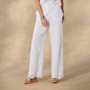 Sporty and feminine. our cotton gauze. eyelet pants are loose and flowing. with wide-leg silhouette. scalloped hem. side seam pockets and back patch pockets. Fully lined. with button closure zip fly and tie at waistline. Machine wash. Imported. Exclusive. Sizes 2?C16. 29.5 inseam