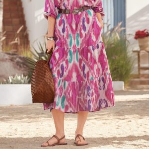 Make a statement in our dramatic. full-length skirt in an artistic ikat print with a broomstick twist. High waist. back zip. back center elastic for comfort. two pockets. Lined. Cotton/spandex. Machine wash. Imported. Exclusive. Sizes XS (0 to 2). S (4 to 6). M (8 to 10). L (12 to 14). XL (16 to 18). XXL (20 to 22). Approx. 38L.