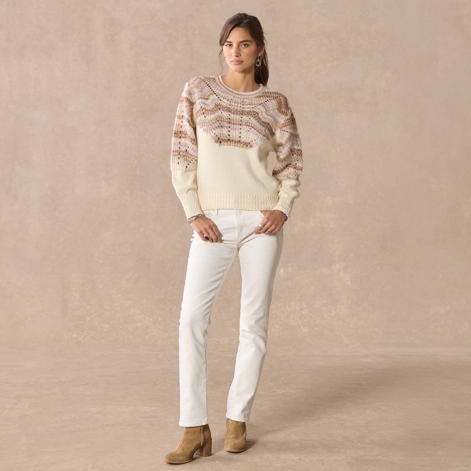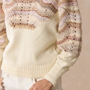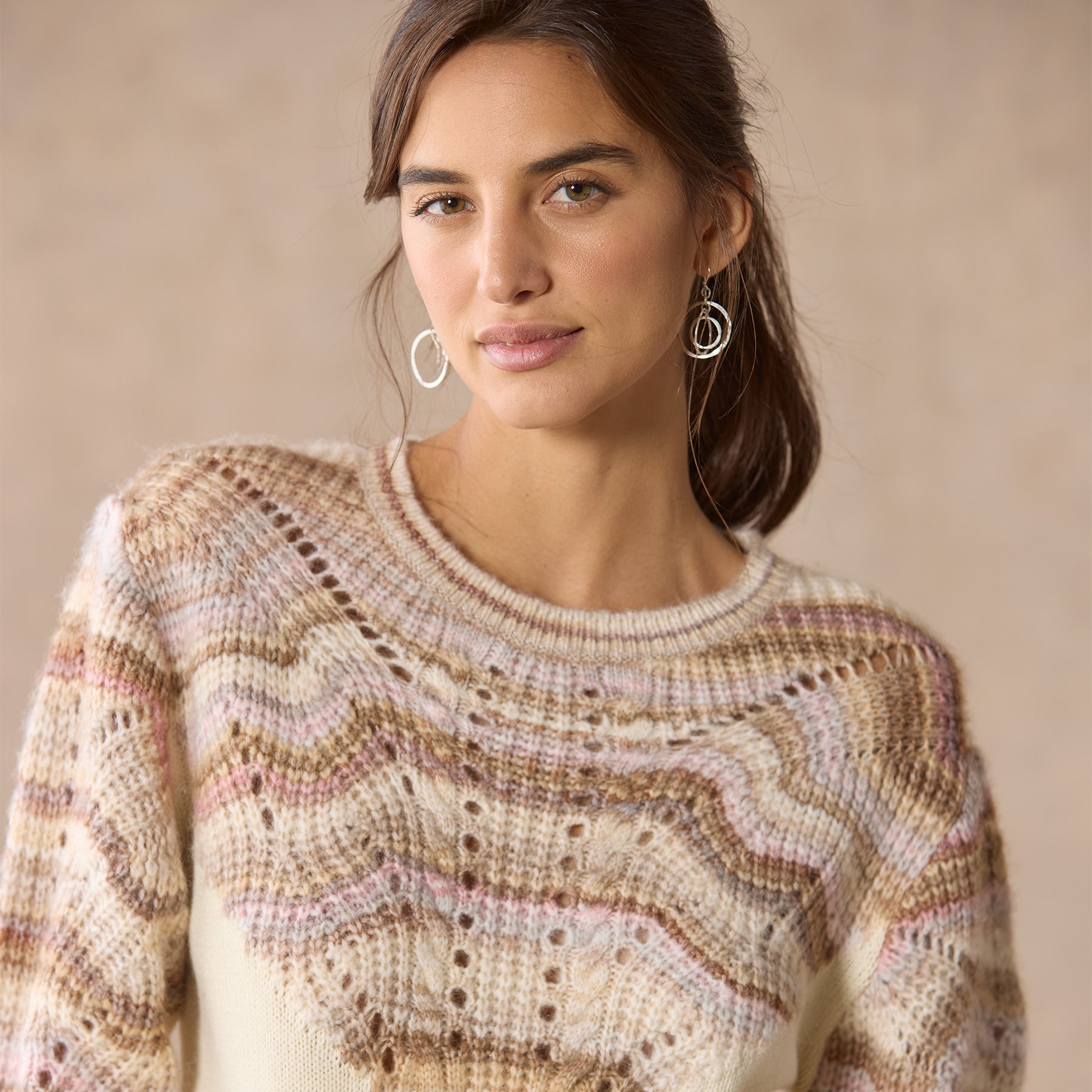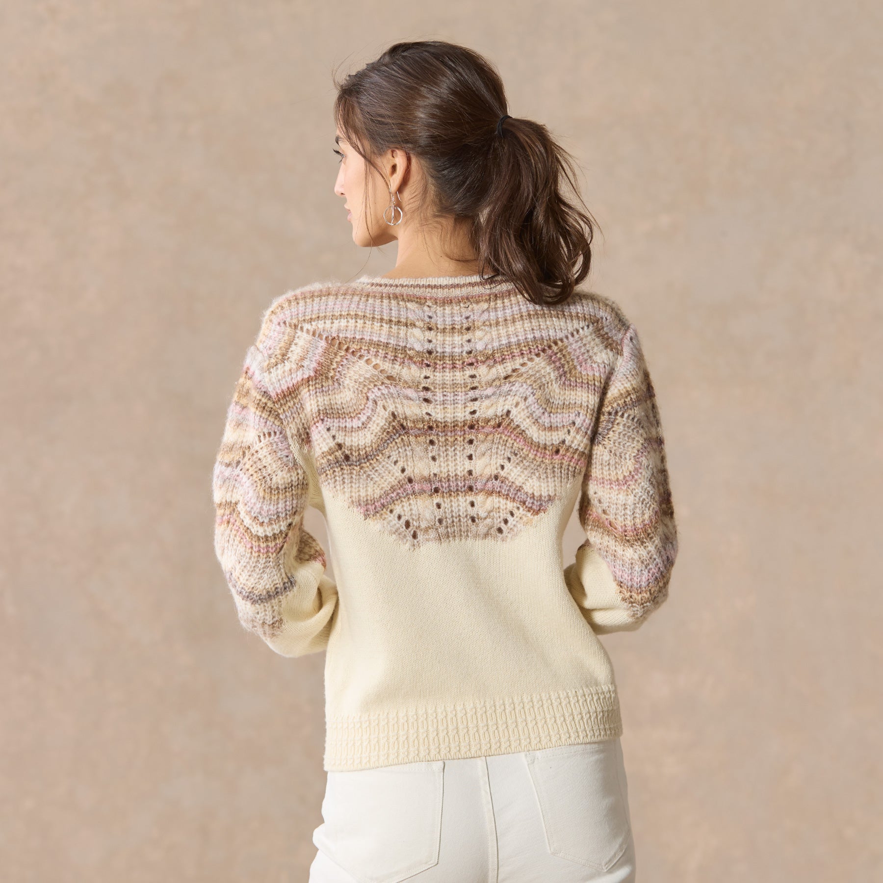In cozy. lofty yarn. our crewneck sweater features a space-dyed intarsia yoke and sleeves. textural stitching with pointelle. cable stitch at cuffs and hem and feminine. volume sleeves. Cotton/polyester/acrylic/nylon/wool. Hand wash. Imported. Exclusive. Sizes XS (0?C2). S (4?C6). M (8?C10). L (12?C14). XL (16?C18). XXL (20?C22). Approx. 22.5l.
