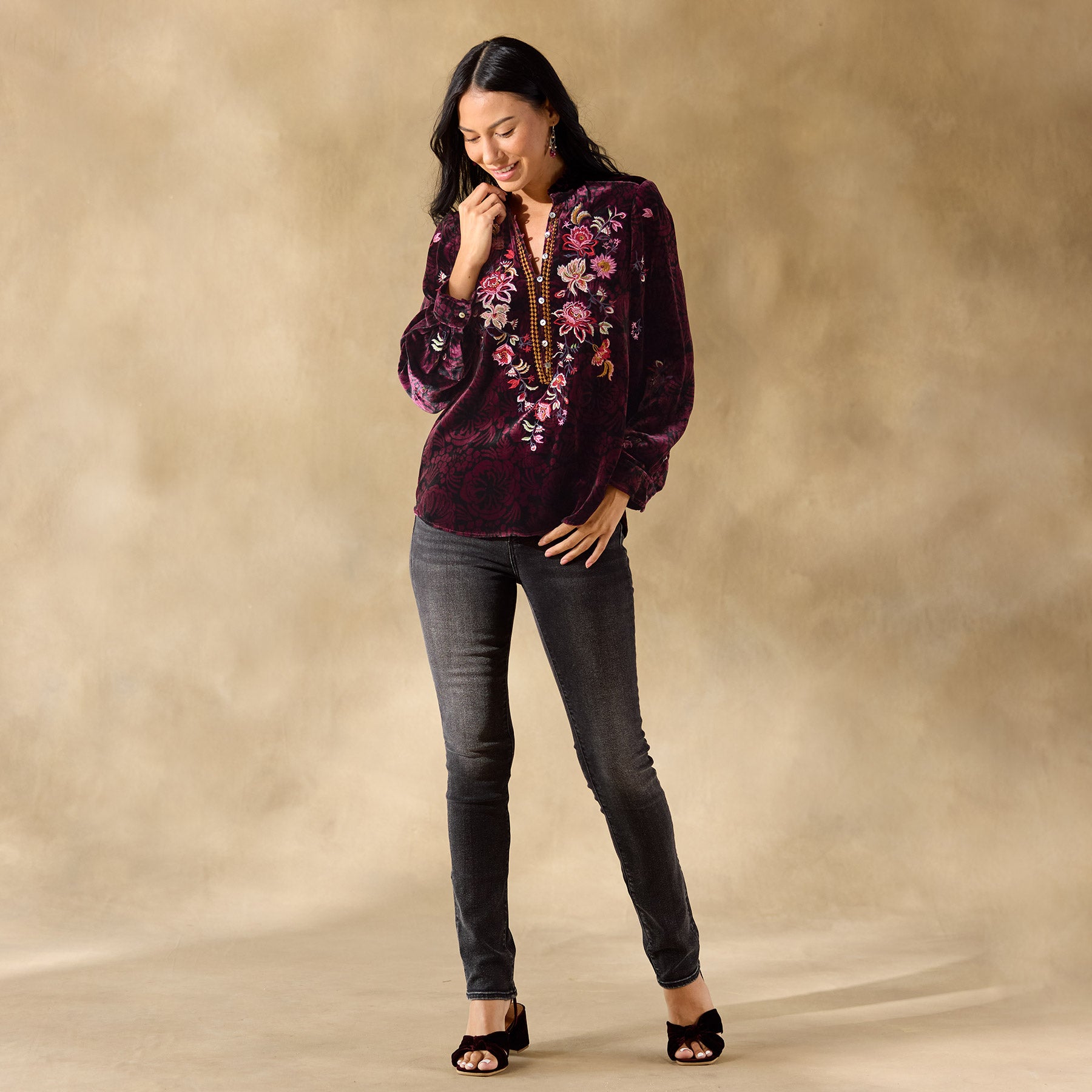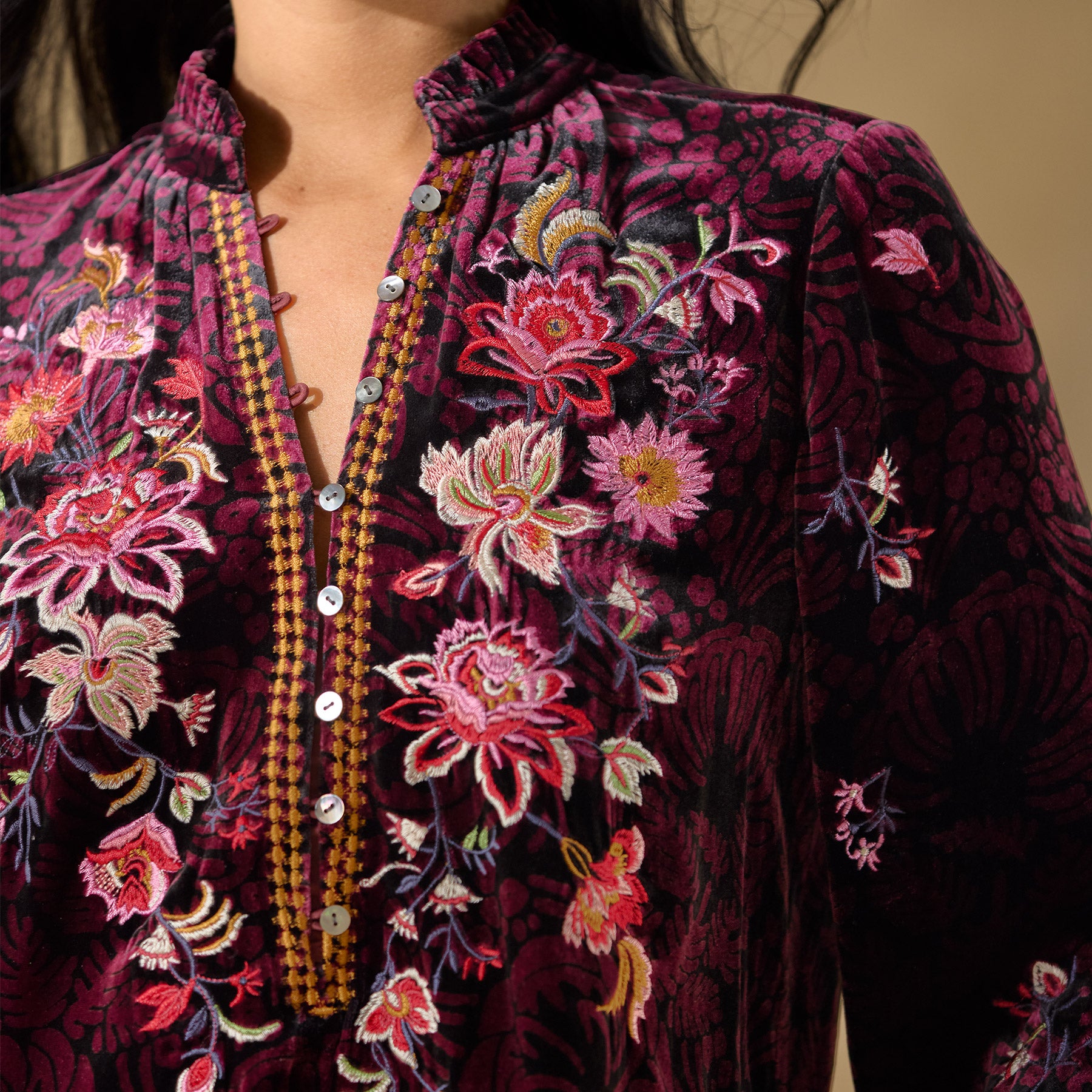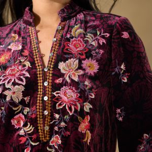 Inspired by a garden in full bloom??colorful embroidery blossoms on our printed. relaxed fit top with ruffle detail at the notch neckline and loop button closure at the henley placket. Viscose/silk. Dry clean. Imported. Exclusive. Sizes?XS (0?C2). S (4?C6). M (8?C10). L (12?C14). XL (16?C18). XXL (20?C22). Approx. 25.5l.