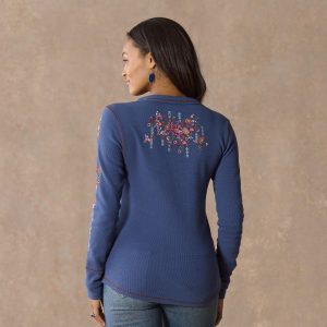 Lovely. multicolored floral and geometric embroidery graces our fitted. notch neck henley with contrast stitching detail. rib trim and princess seams. Metal buttons. Cotton. Machine wash. Imported. Exclusive. Sizes XS (0–2). S (4–6). M (8–10). L (12–14). XL (16–18). XXL (20-22). Approx. 26l.