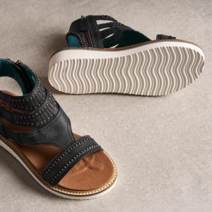 Studwork on the front and back. a slit design and stitching detail draw the eye to these textured. distinctive sandals. Inside zipper. leather lined. Leather. Imported. Whole and half sizes 6-10. 11.