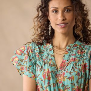 Feminine and flowing. a palette of gorgeous florals with contrast border print details. pintucking. elastic waist. double flutter sleeves and tiered hem. Fully lined. Cotton/silk. Hand wash. Imported. Exclusive. Sizes XXS (00). XS (0?C2). S (4?C6). M (8?C10). L (12?C14). XL (16?C18). Approx. 49.5l.