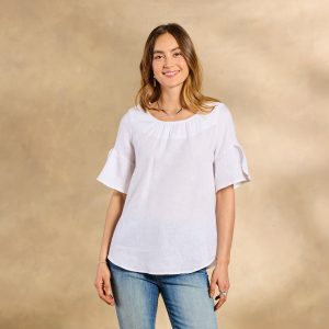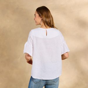 You’ll feel free in our flowing and relaxed top with elegant flutter sleeves and shirring at the neckline. Keyhole at the back with button closure. Linen. Hand wash. Imported. Exclusive. Sizes XS (0–2). S (4–6). M (8–10). L (12–14). XL (16–18). XXL (20–22). Approx. 25l.