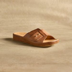 Go in comfort and style in these vegetable-tanned leather sandals with unique slip-through design straps and metal stud accents. Cork or rubber socks. rubber soles. Handcrafted. Imported. Whole sizes 6?C11. 1 heel.