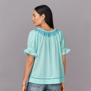 Feminine and full of surprising texture. our relaxed pullover top with contrast smocking. ruffles and scalloped neckline flows with pretty lace details. Button placket with loops. elastic cuffs. Cotton. Machine wash. Imported. Exclusive. Sizes XXS (00). XS (0-2). S (4-6). M (8-10). L (12-14). XL (16-18). Approx. 22.5l.
