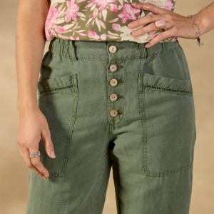 Our relaxed-fit Rivera Pants feature a classic straight-leg fit with a flat front and comfy elastic back??plus pretty ladder lace on the patch pockets. Cotton/linen. Machine wash. Imported. Exclusive. Sizes 0?C14. 26 inseam.