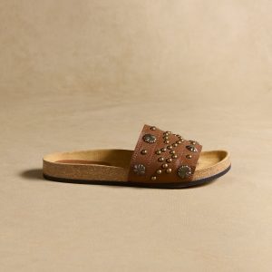 Handcrafted and artfully designed. these leather. slides are studded with burnished silver details in a carefree. equestrian-inspired pattern. By Penelope Chilvers. Spain. Euro whole sizes 36 to 42. 36 (US 5.5). 37 (US 6.5). 38 (US 7.5). 39 (US 8.5). 40 (US 9.5). 41 (US 10). 42 (US 11).