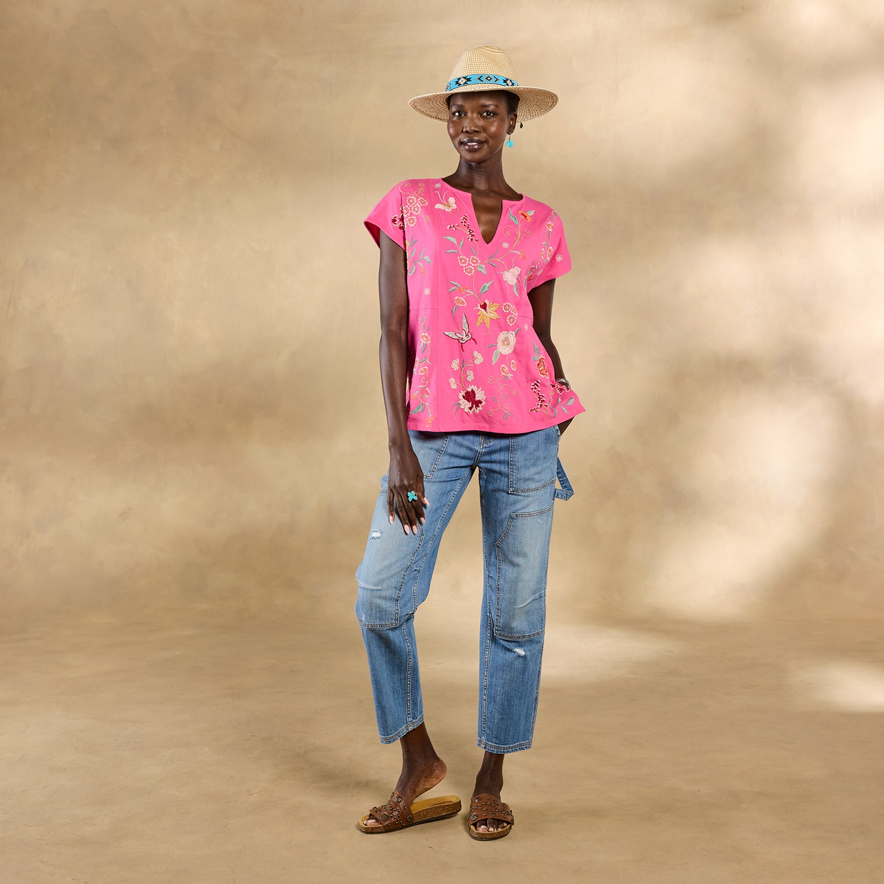 Beautiful floral and geometric embroidery flutters across the front and back of this easy-fit. notch neck top with cap sleeves and side slits. Cotton. Machine wash. Imported. Sizes XS (4). S (6). M (8-10). L (12). XL (14). XXL (16). Approx. 26l.