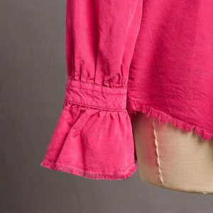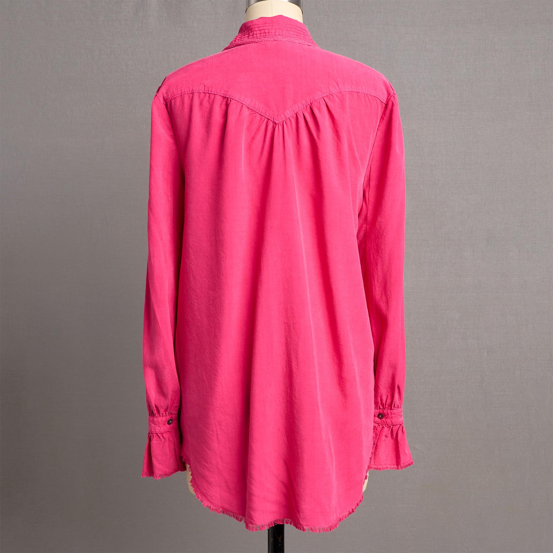 Western style at its most feminine. in beautifully washed. super soft and draping Tencel®. With embroidery and lace insert details at front panel and collar. ruffle cuffs. raw edges. delicate loop closures on smoked shell button front. shirttail hem and Western-style yoke front and back. Machine wash. Imported. Exclusive. Sizes XXS (00). XS (0-2). S (4-6). M (8-10). L (12-14). XL (16-18). Approx. 26l.