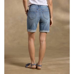 These broken-in shorts with a raw hem and just-so fading will become an indispensable part of your warm-weather wardrobe. Cotton/spandex. Machine wash. Imported. Exclusive. Sizes 24 to 32. 9 inseam. 11 rise. 18-1/2 leg opening.