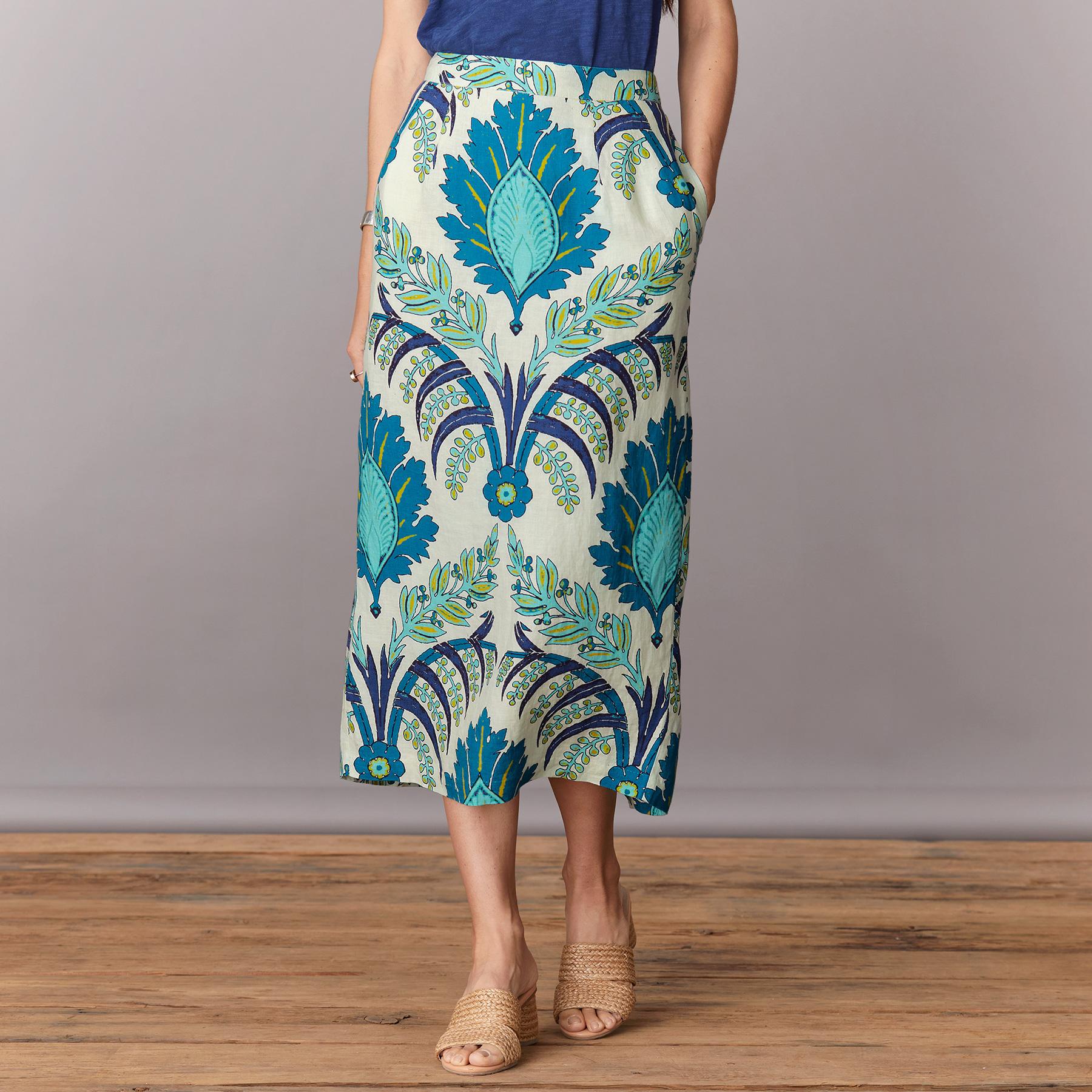 The joy of color. Our stunning engineered print linen pencil skirt is so flattering with side seam pockets. metal zipper at back. elastic at back waistband for comfort. and back slit. Fully lined. Machine wash. Imported. Exclusive. Sizes 0-14. Approx. 31.5l.