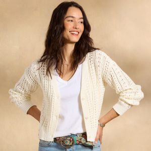 Great to layer over dresses. our feminine. V-neck cardigan is garment dye acid washed. with an open. textural stitch and rib trim. Slightly cropped. Cotton. Hand wash. Imported. Exclusive. Sizes XS (0–2). S (4–6). M (8–10). L (12–14). XL (16–18). XXL (20–22). Approx. 20.5l.